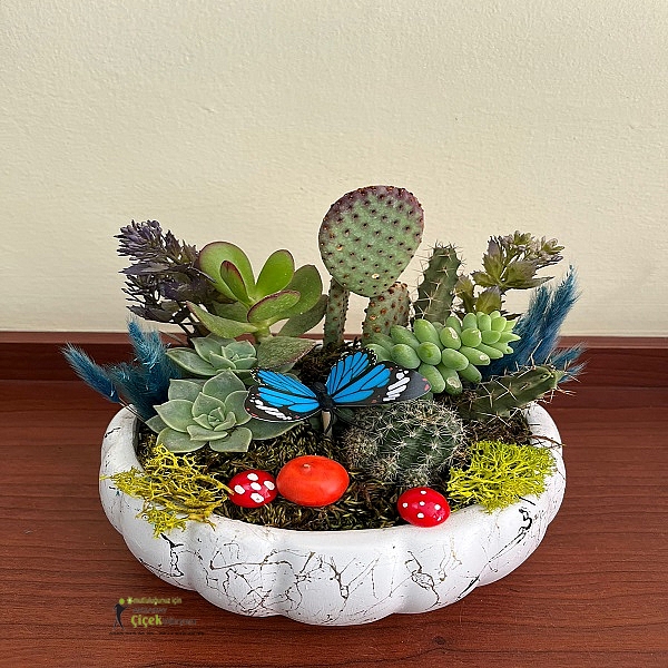 toprak saksıda canlı bitkilerle hazırlanmış teraryum
